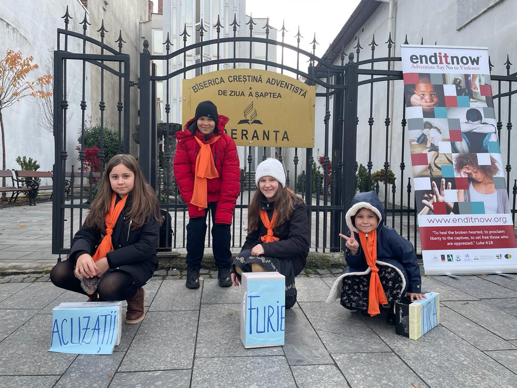After the devotional, a team of children, young people, women, and men took to the streets and, with permission from the local City Hall, offered the people of Cluj the booklet "Dynamics of Domestic Violence" (provided by the Romanian Union Women's Ministries Department) and anti-bullying leaflets for children (provided by ADRA Romania).